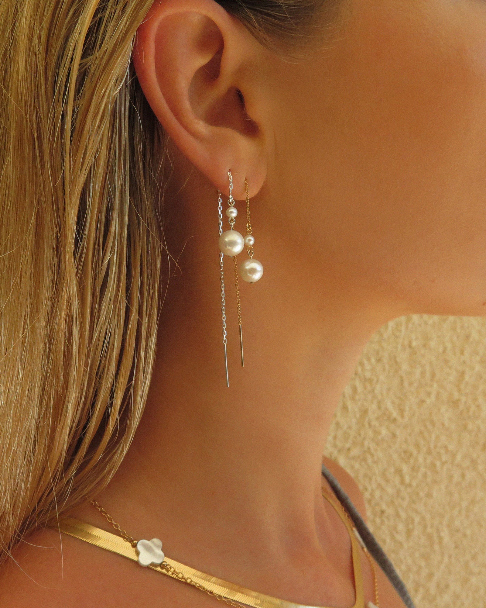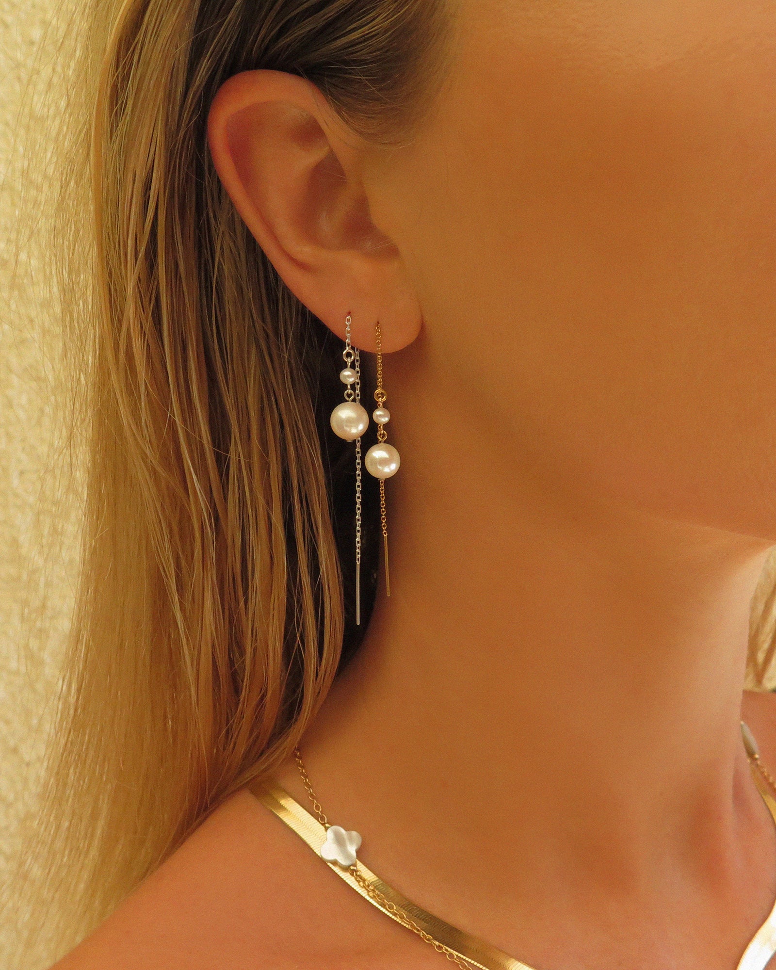 Effortlessly elegant with a touch of modern cool, these earrings are your new go-to for low-effort luxe. Featuring two luminous freshwater pearls suspended on a fine 14k yellow gold fill threader chain, they’re designed to move with you - catching the light and turning heads. Lightweight, hypoallergenic, and tarnish-resistant, they’re the ultimate plus-one for a wedding, sunset cocktails, birthday dinners, or elevated everyday styling.