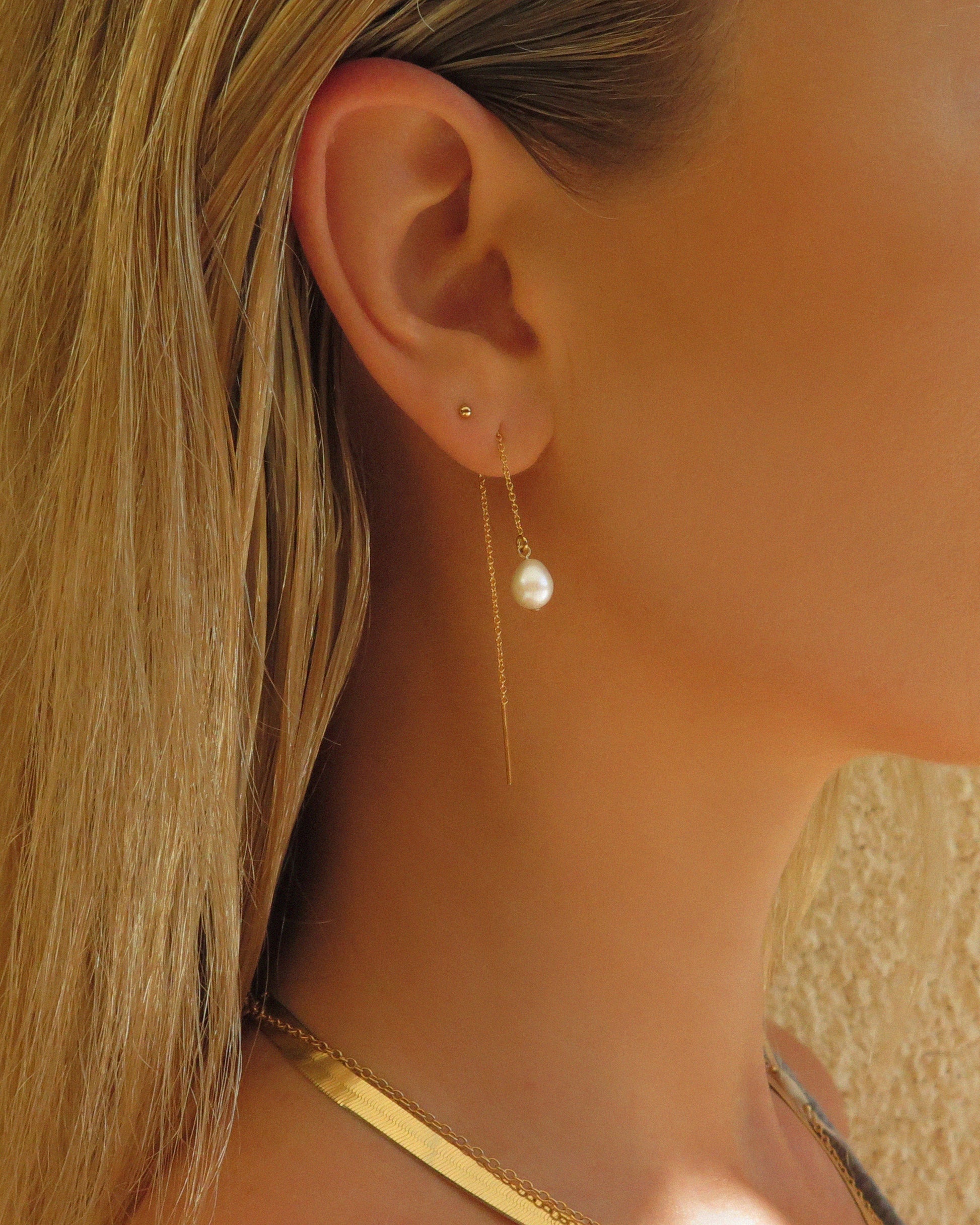 Effortlessly elegant with a touch of luxury - these earrings bring a modern twist to the timeless pearl. The beautiful 14k gold fill chain threads through the ear with subtle movement, anchoring a luminous freshwater pearl that catches the light from every angle. Hypoallergenic and tarnish-resistant, they’re made to be worn from beachside brunches to rooftop proseccos. A chic gifting moment for bridesmaids, birthdays or just because she’s that girl.
